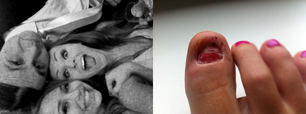 Ano, šla jsem na plese ze záchoda, zapomněla zvednout pořádně nohu a silou jsem nakopla schod palcem v otevřený lodičce. Ano, mňam. Nehet se zalil krví dole, úplně tam byl proužek krve jen a já jse cejtila, že není pevně na noze. Kesida to strašně nevydržela a nutila mě to zalepit. Doma jsem se rozhodla pro odtrhnutí, protože nehet fakt visel si docela. Vytrhla jsem ho, snažila se neomdlít při pohledu na trčící kusy masa do vzduchu, který Kesida musela odstřihnout nůžkama. Chirurg<3